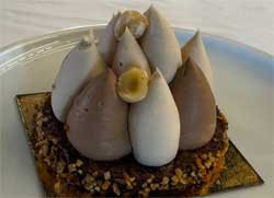 The kitchen was running very efficiently and before we finished our appetizer the Musar (Red Drum) filet was delivered to our table. The fish dish was a beautifully presented platter with two perfectly prepared filets. For a twist, the fish was served on a bed of mushrooms, peas and several mushroom tortellinis, shaped like florets. These were flavored with a lovely sauce and topped with grated Parmesan cheese. After eating one filet and my share of the vegetable sauce, I reluctantly passed the plate with the second filet, to my waiting companion. We cannot recommend this dish highly enough. The quality of the fish, the mix of vegetables and pasta florets, the beautiful presentation, is a culinary experience.